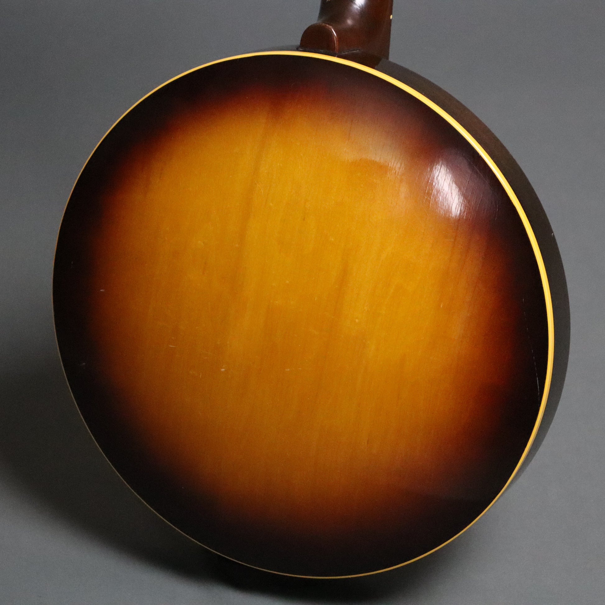 This Gibson RB-100 Model 5 String Resonator Banjo (1957) was made in Kalamazoo, Michigan. It has a sunburst lacquer finish, a laminated maple resonator and rim, and a mahogany neck with a rosewood fingerboard. It has an unbound dot inlaid fingerboard and single-bound sunburst resonator.