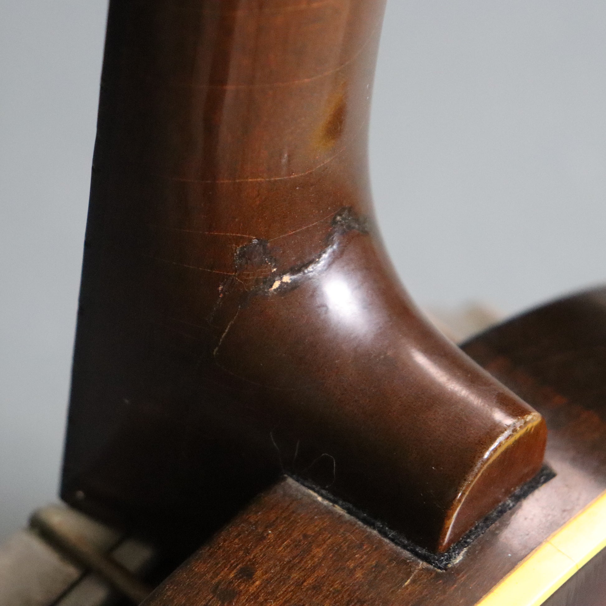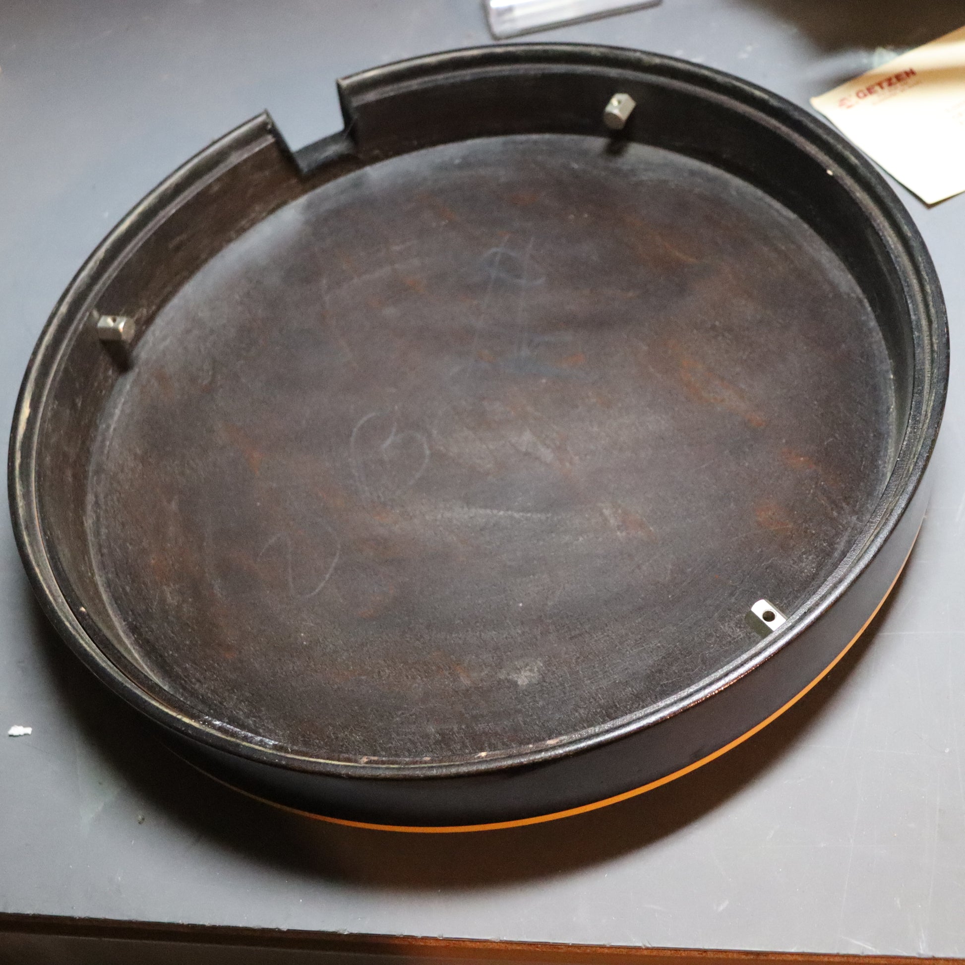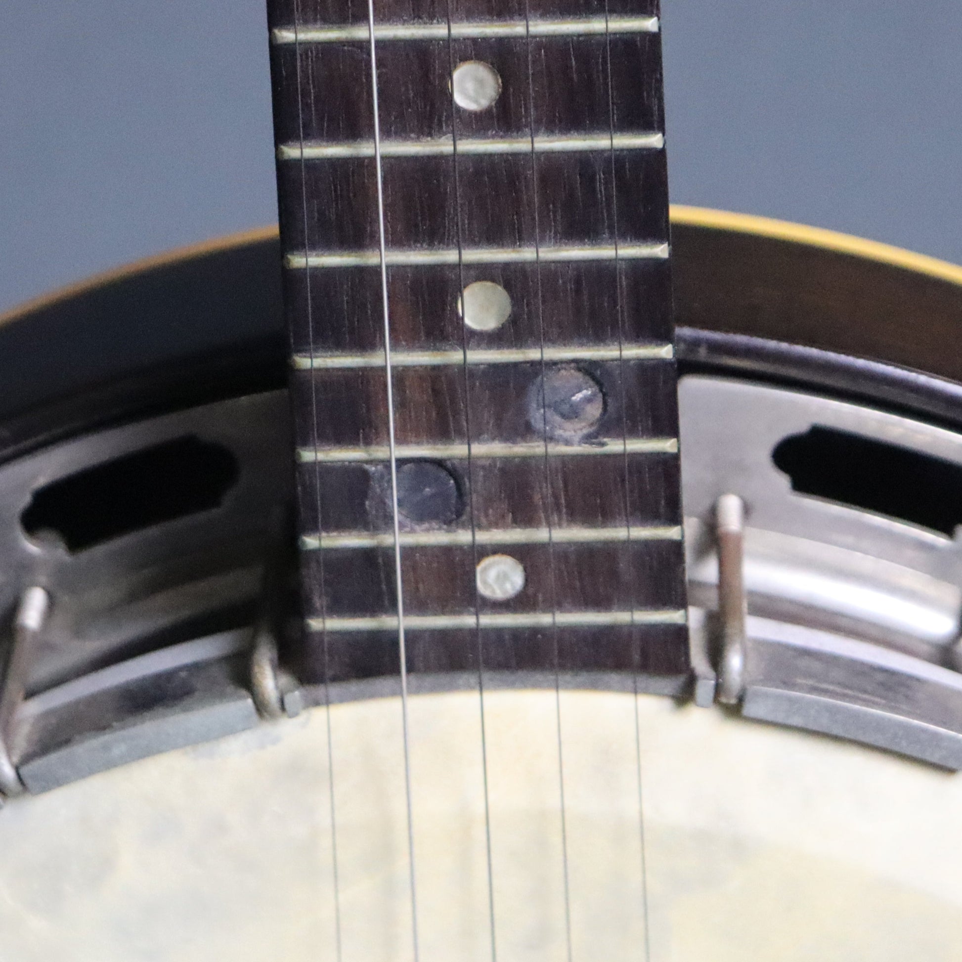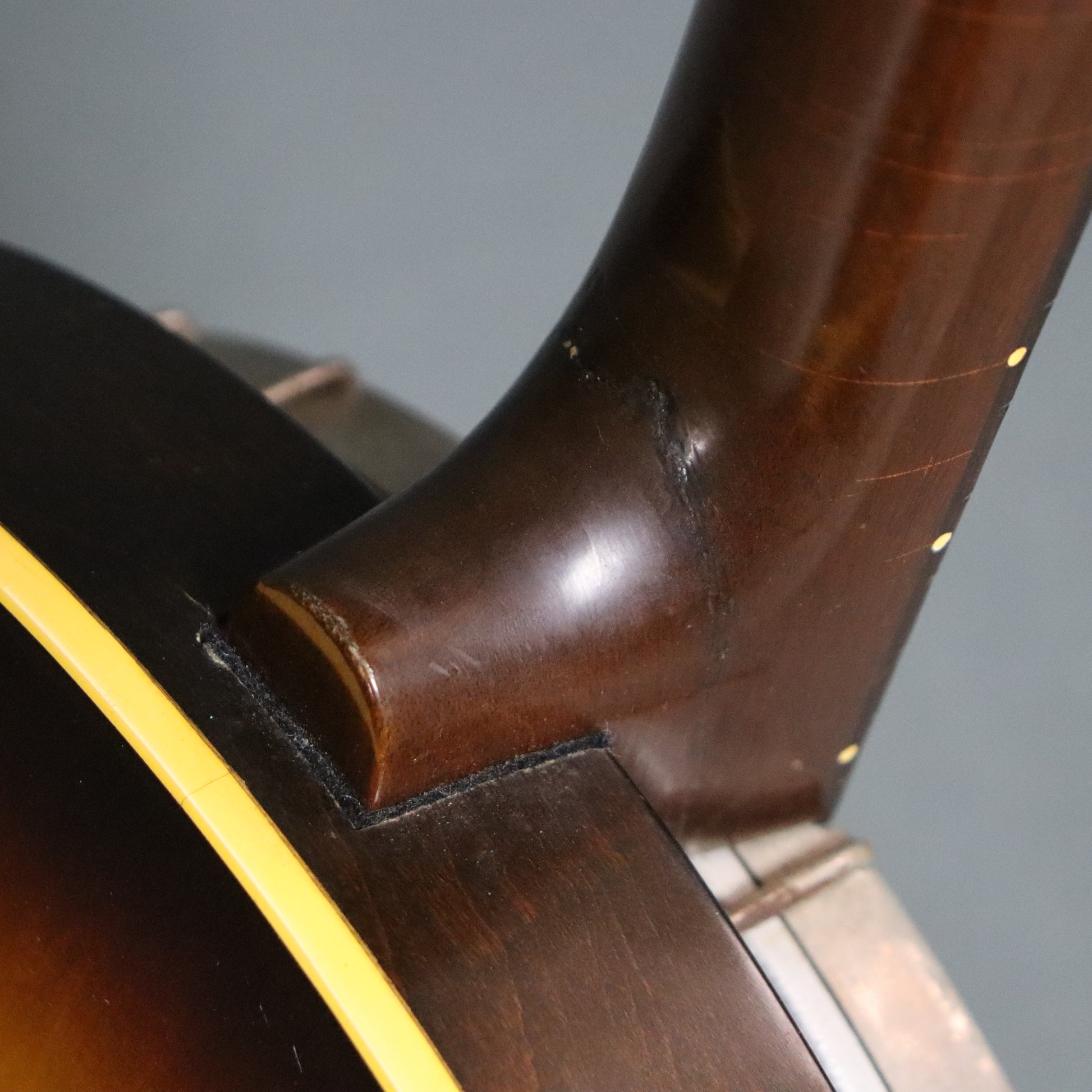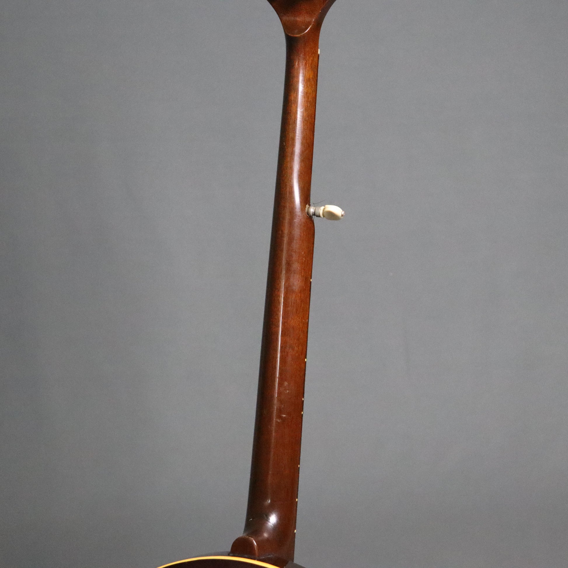 This banjo remains in original condition. Its resonator is in lovely shape with a beautiful sunburst finish. The mahogany neck suffered a break at the heel and a subsequent undisguised repair, including two screws set into the fingerboard, prior to its arrival here. It also has a small cosmetic chip in the headstock and other signs of use. It's quite playable as is but may benefit from a setup and fret polish to maximize playability. No case.