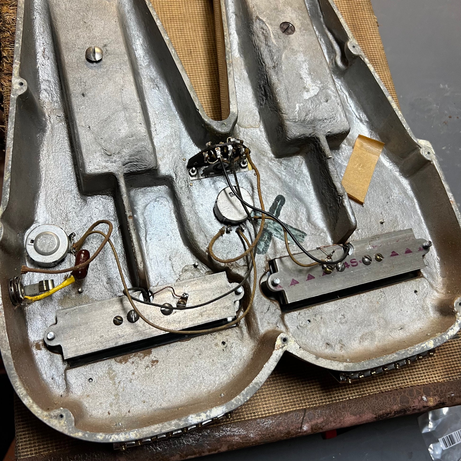 Very nice overall with light wear from normal use. The three way switch picks the top or bottom neck with both on in the middle position. It has master volume and tone pots with white Bakelite knobs. Electronics are as shown. Pickups are very strong. It sports two sets of original Kluson Deluxe tuners They all function correctly and stay in tune when set. It’s missing three original back screws. Two are replaced. Comes with solid vintage tweed covered hard case. A fine example of a rare Rickenbacker steel.