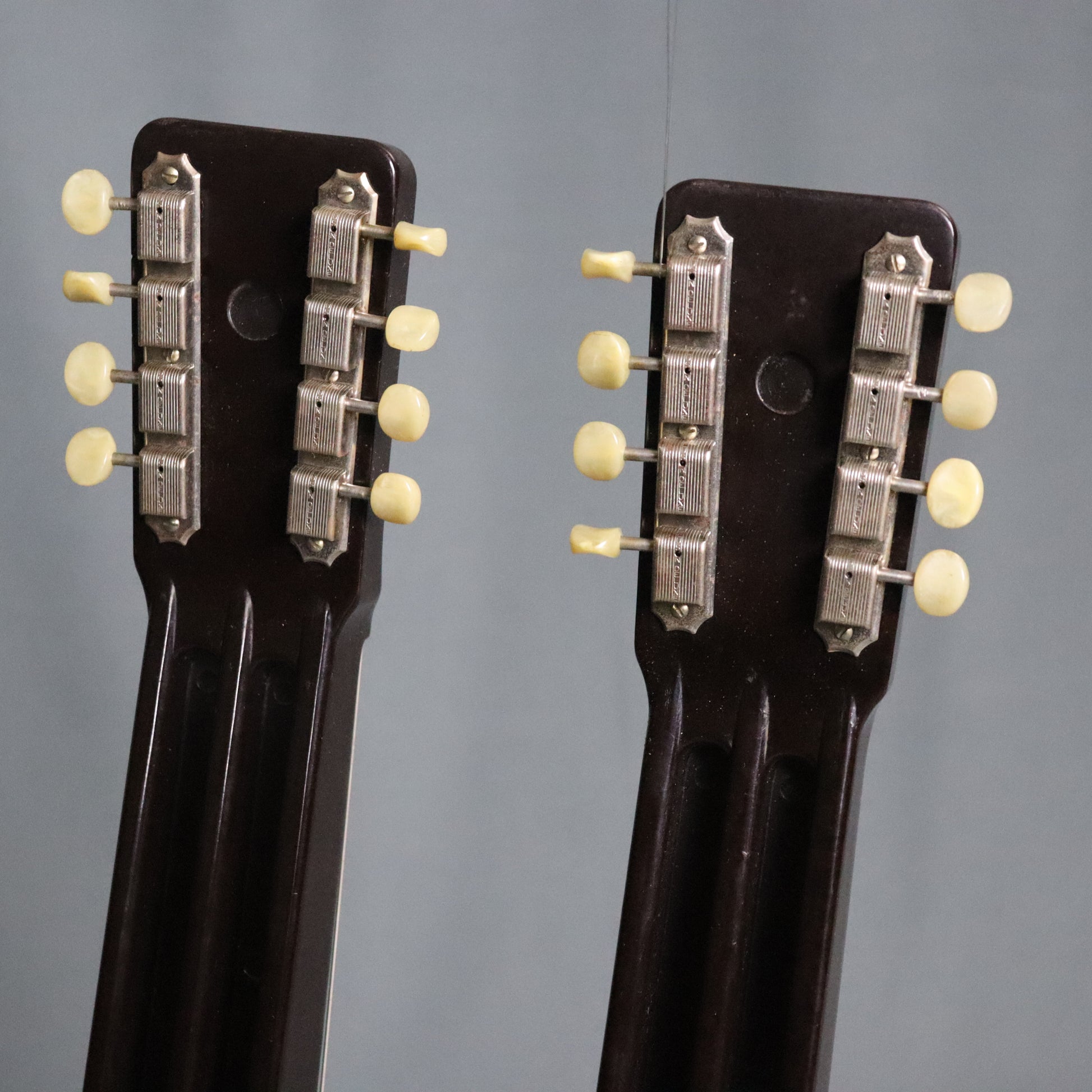 This Rickenbacker double neck 8 string D-16 model lap steel guitar (c. 1947) is a wonderful instrument. It was made in Los Angeles, California, and features a metallic enamel finish, cast metal body, molded Bakelite necks, and its original hard shell case.